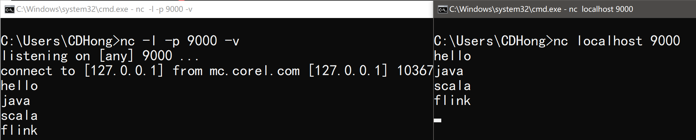 nc -l -p 9000 -v监控9000端口,接收数据nc localhost 9000进行连接,并发送数据