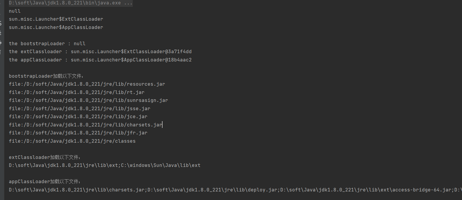 package cn.phlos.csdn.demo;import sun.misc.Launcher;import java.net.URL;public class TestJDKClassLoader {public static void main(String[] args) {System.out.println(String.class.getClassLoader());System.out.println(com.sun.crypto.provider.DESKeyFactory.class.getClassLoader().getClass().getName());System.out.println(TestJDKClassLoader.class.getClassLoader().getClass().getName());System.out.println();ClassLoader appClassLoader = ClassLoader.getSystemClassLoader();ClassLoader extClassloader = appClassLoader.getParent();ClassLoader bootstrapLoader = extClassloader.getParent();System.out.println("the bootstrapLoader : " + bootstrapLoader);System.out.println("the extClassloader : " + extClassloader);System.out.println("the appClassLoader : " + appClassLoader);System.out.println();System.out.println("bootstrapLoader加载以下文件:");URL[] urls = Launcher.getBootstrapClassPath().getURLs();for (int i = 0; i < urls.length; i++) {System.out.println(urls[i]);}System.out.println();System.out.println("extClassloader加载以下文件:");System.out.println(System.getProperty("java.ext.dirs"));System.out.println();System.out.println("appClassLoader加载以下文件:");System.out.println(System.getProperty("java.class.path"));}