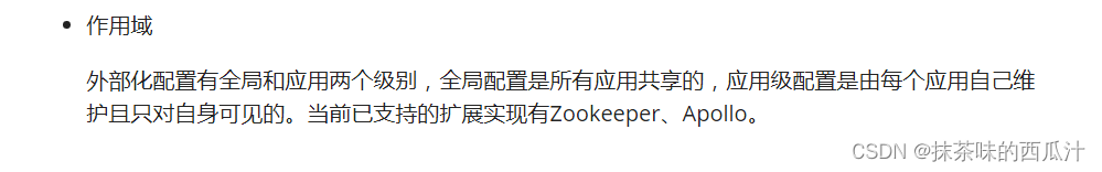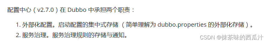 外部化配置。启动配置的集中式存储 (简单理解为dubbo.properties的外部化存储)。 服务治理。服务治理规则的存储与通知。