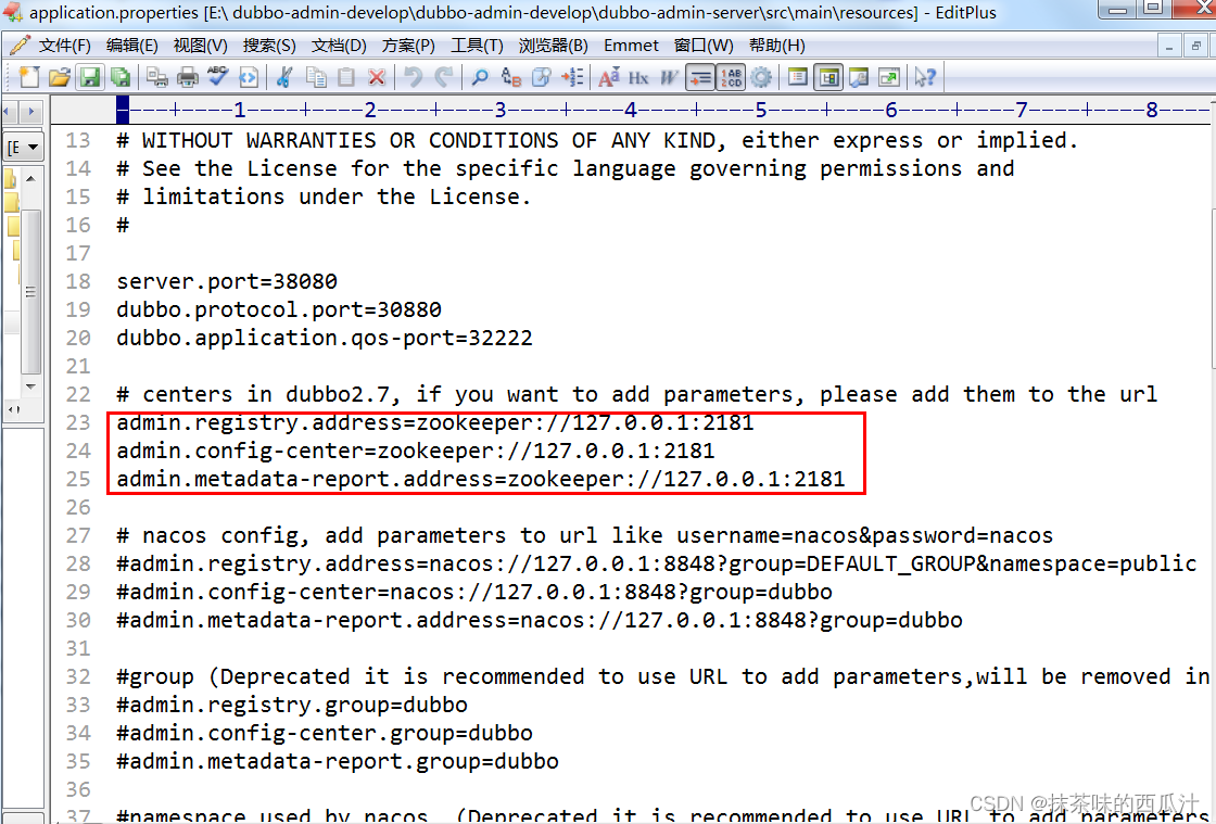 我们可以在这个文件中看到我们的配置中心数据。但是我们用的是本地的zookeeper,所以我们这里不需要去更改。