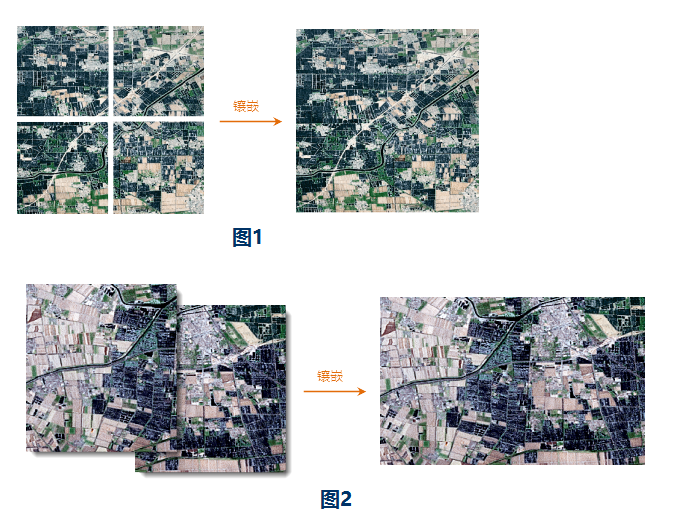 将两个或两个以上栅格数据集以地理坐标为参照组合成一个栅格数据集。下面分别展示了两种栅格数据集镶嵌的示例。