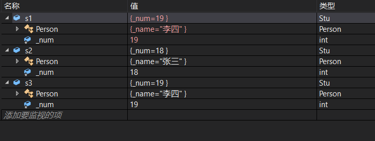 {Stu s1("张三", 18);Stu s2(s1);Stu s3("李四", 19);s1 = s3;//此处打断点return 0;