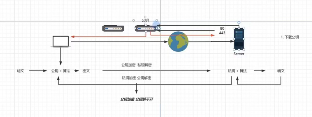 非对称算法是有一个公钥和私钥,服务器保留私钥和公钥。当用户请求服务器的时候,用户首先下载服务器的公钥,明文通过公钥加算法变成密文。然后这个密文在网络中传输,但是除了服务器端没人能解开这个数据。所以存在一定的安全性。在返回数据的时候,使用私钥加算法加密数据,由客户端来解密接收数据。