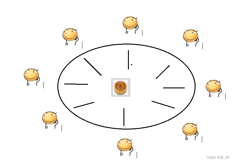 每个哲学家只做两件事:思考人生或者吃面条,思考人生的时候就会放下筷子。吃面条就会拿起左右两边的筷子(先拿起左手,再拿起右手)