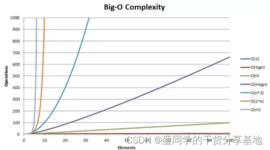 将各大 O 阶表示的复杂度绘制成图,能够更加直观的观察各阶类型对复杂度的影响程度:
