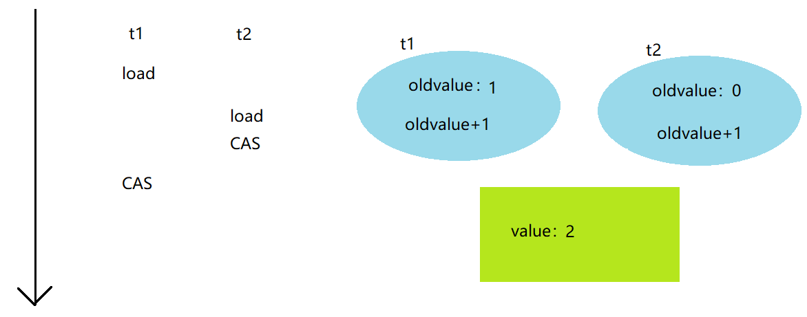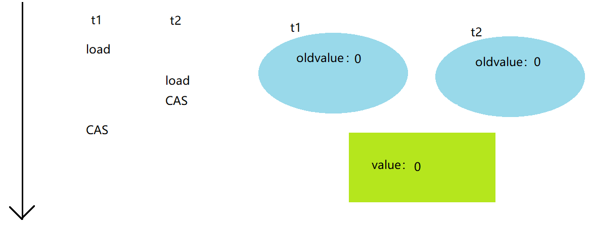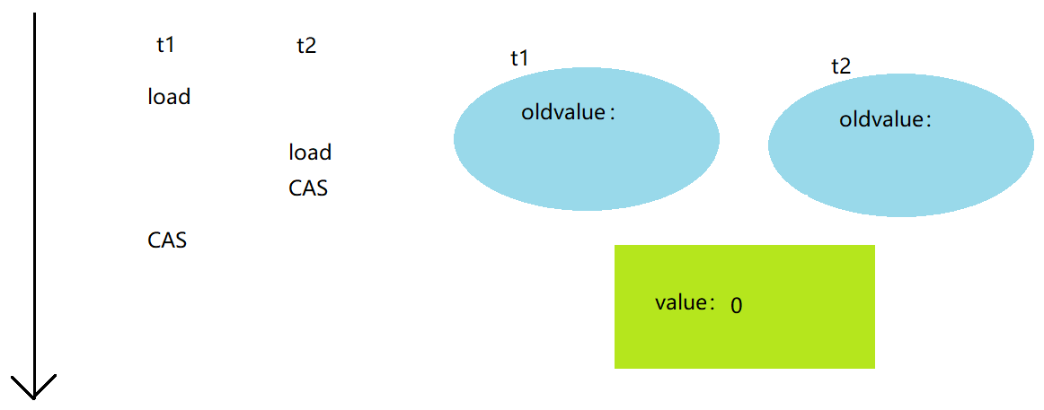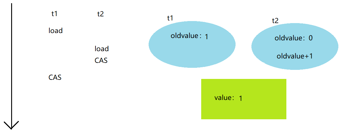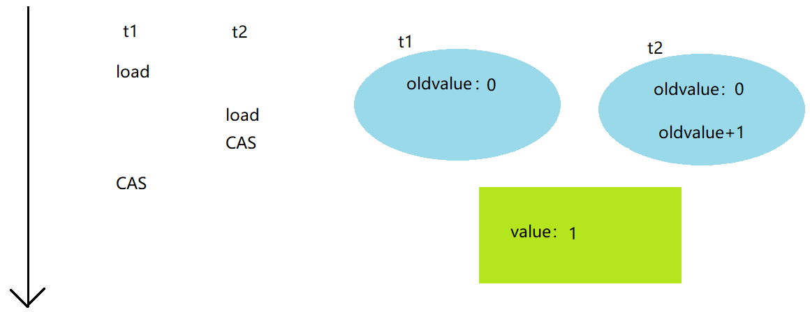1、t1 先执行 load ,把 value 的值读到 oldvalue 中。