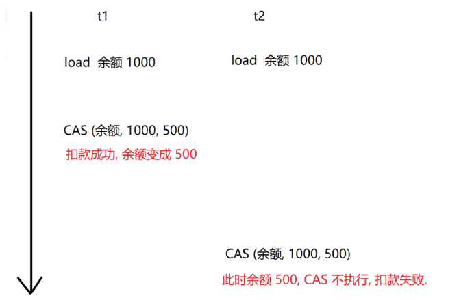 紧接着 t1 执行 CAS 比较一下,看看此时的余额是不是 1000,如果是 1000 就扣 500。