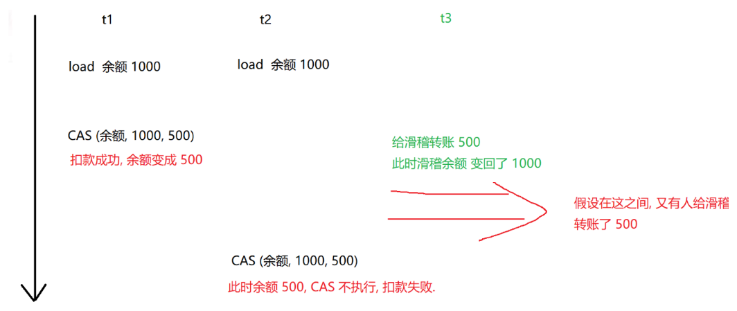 如果在执行果第一个 CAS 后,有人给滑稽转了 500 元,此时余额又变成了 1000。