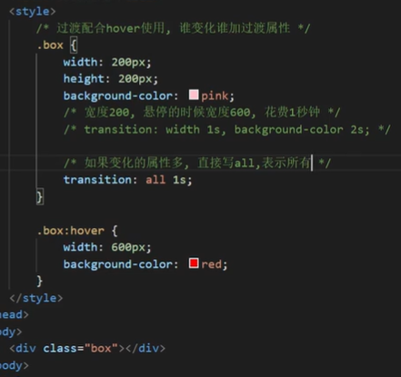 (box的默认属性和hover属性中width和background-color属性不同,在默认属性中设置transition所以鼠标移入时会进行过渡,且时间设置为1s,所以变化会通过1s完成,可以单独设置不同属性的transition,也可以直接把第一个参数设置为all,程序会自动检查不同的样式进行过渡)