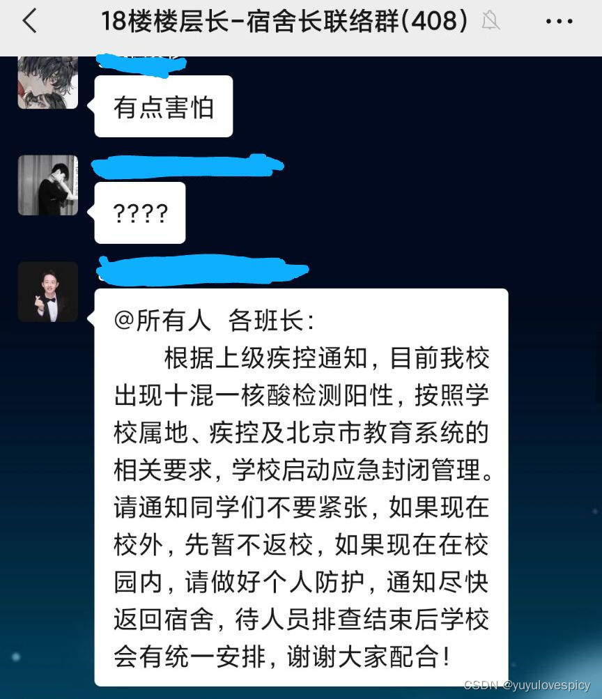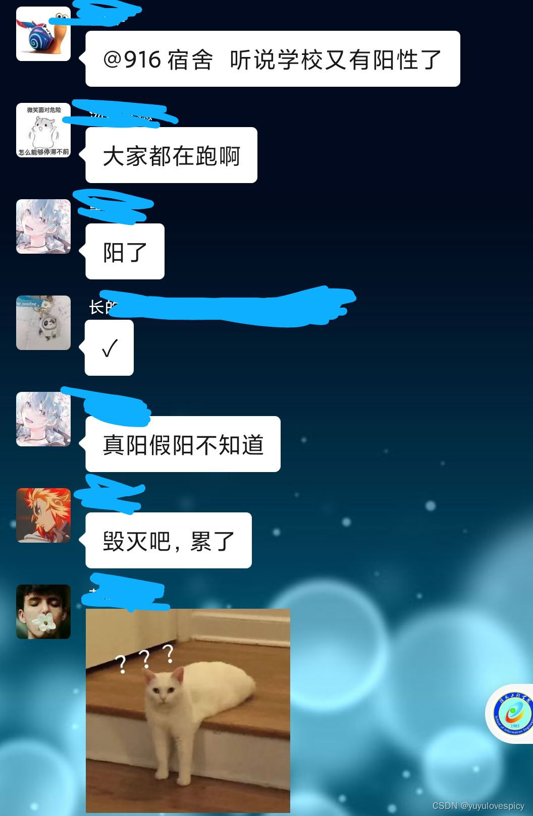 后来学校第一次阳性清零,封寝结束。没错这只是第一次,在清零的第二天,我们学校又阳了!!!第二次漫长的封寝开始!!!