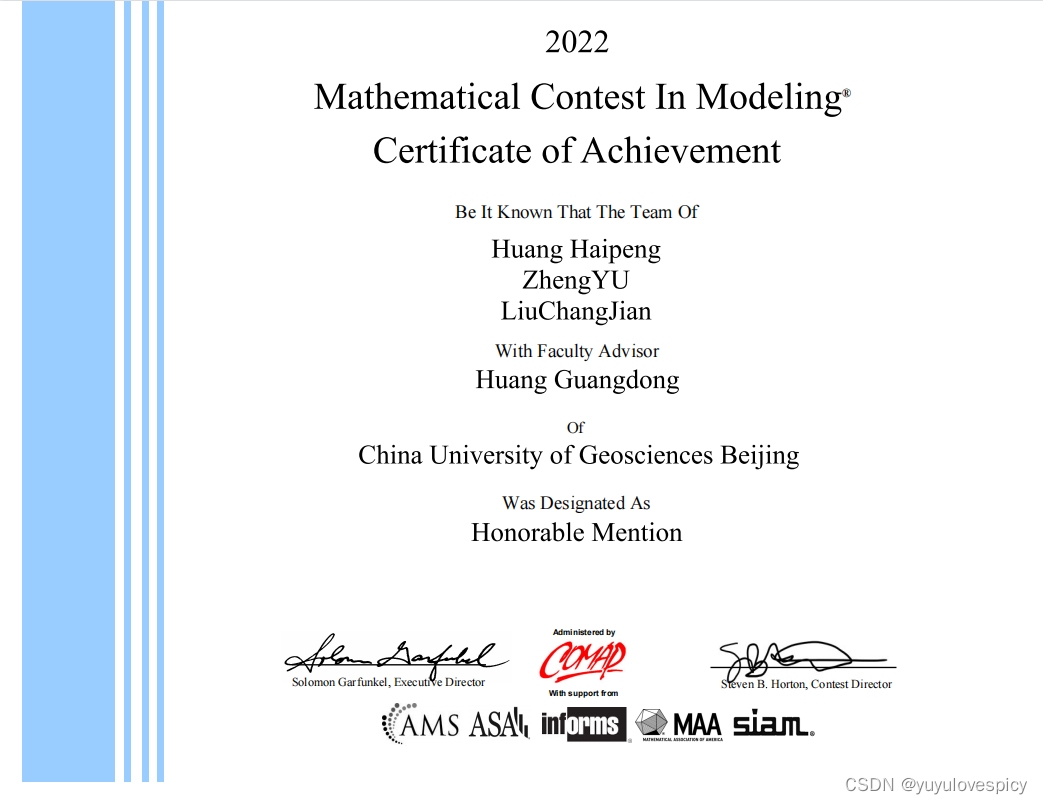 之后的一个寒假,我又是忙起了数模,也就是我们常说的美赛,我可以说这是我压力最大的一段时期,每天学习时间可以说长达12个小时不为过。早上八点到家附近的自习室,晚上十一点回去,每天都是忙活数学建模知识的学习,一开始是学习MATLAB,后来又是学习各种模型,最后是学习论文书写,在这个过程当中,我还在自学数据结构的计算机知识,这是一个痛苦且漫长的过程,好在几个月的坚持让我们三个大一的学生最终收获了一个简单的H奖,我的代码技术水平也在提升。