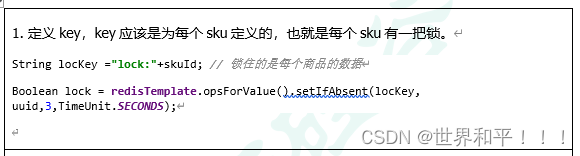 public void testLockLua() {//1 声明一个uuid ,将做为一个value 放入我们的key所对应的值中String uuid = UUID.randomUUID().toString();//2 定义一个锁:lua 脚本可以使用同一把锁,来实现删除!String skuId = "25"; // 访问skuId 为25号的商品 100008348542String locKey = "lock:" + skuId; // 锁住的是每个商品的数据// 3 获取锁Boolean lock = redisTemplate.opsForValue().setIfAbsent(locKey, uuid, 3, TimeUnit.SECONDS);// 第一种: lock 与过期时间中间不写任何的代码。// redisTemplate.expire("lock",10, TimeUnit.SECONDS);//设置过期时间// 如果trueif (lock) {// 执行的业务逻辑开始// 获取缓存中的num 数据Object value = redisTemplate.opsForValue().get("num");// 如果是空直接返回if (StringUtils.isEmpty(value)) {return;}// 不是空 如果说在这出现了异常! 那么delete 就删除失败! 也就是说锁永远存在!int num = Integer.parseInt(value + "");// 使num 每次+1 放入缓存redisTemplate.opsForValue().set("num", String.valueOf(++num));/*使用lua脚本来锁*/// 定义lua 脚本String script = "if redis.call('get', KEYS[1]) == ARGV[1] then return redis.call('del', KEYS[1]) else return 0 end";// 使用redis执行lua执行DefaultRedisScript redisScript = new DefaultRedisScript<>();redisScript.setScriptText(script);// 设置一下返回值类型 为Long// 因为删除判断的时候,返回的0,给其封装为数据类型。如果不封装那么默认返回String 类型,// 那么返回字符串与0 会有发生错误。redisScript.setResultType(Long.class);// 第一个要是script 脚本 ,第二个需要判断的key,第三个就是key所对应的值。redisTemplate.execute(redisScript, Arrays.asList(locKey), uuid);} else {// 其他线程等待try {// 睡眠Thread.sleep(1000);// 睡醒了之后,调用方法。testLockLua();} catch (InterruptedException e) {e.printStackTrace();}}