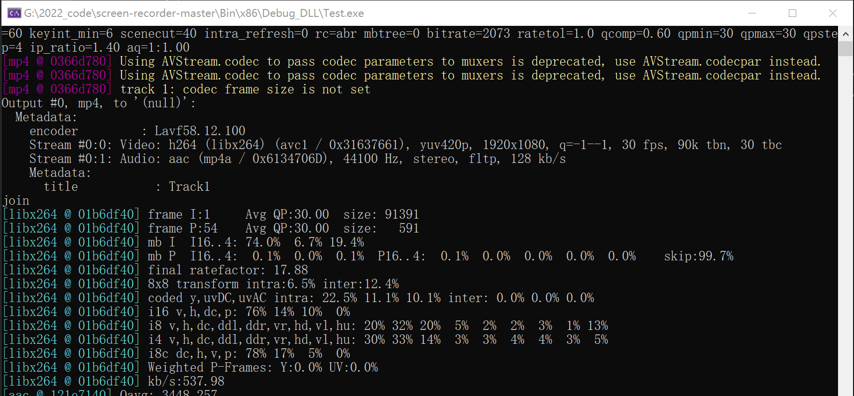 使用后,出现不少问题;首先32位的avilib里的pos是有符号的long型,如果要保存的图片大小大于long型的有效范围,则会崩溃;如果是1920*1080的分辨率,视频只能保存2分钟左右;其次是视频和音频是分别录制的,需要使用ffmpeg.exe合并,如果连续录制2个小时,avi和mav的大文件使用ffmpeg合并,可能会出现问题;