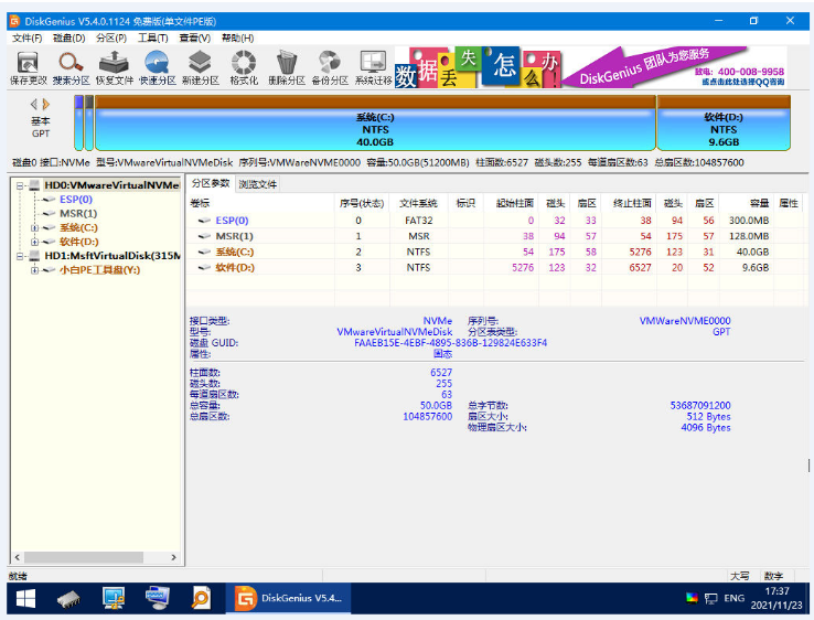 3、电脑进入 PE 系统之后,点击打开电脑桌面上的分区工具(DiskGenius)。按照以下图片上的提示,选择自己的硬盘,软件将会开始执行快速分区。