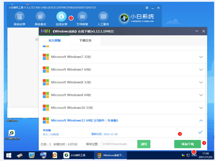 5、分区成功后,点击打开桌面的小白装机工具,点击在线安装,根据你自己的需求选择windows镜像文件,选定之后点击添加下载。