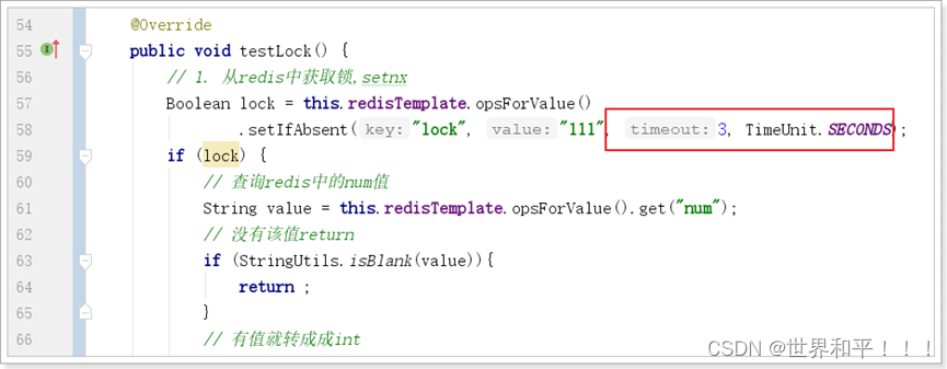 public void testLockLua() {//1 声明一个uuid ,将做为一个value 放入我们的key所对应的值中String uuid = UUID.randomUUID().toString();//2 定义一个锁:lua 脚本可以使用同一把锁,来实现删除!String skuId = "25"; // 访问skuId 为25号的商品 100008348542String locKey = "lock:" + skuId; // 锁住的是每个商品的数据// 3 获取锁Boolean lock = redisTemplate.opsForValue().setIfAbsent(locKey, uuid, 3, TimeUnit.SECONDS);// 第一种: lock 与过期时间中间不写任何的代码。// redisTemplate.expire("lock",10, TimeUnit.SECONDS);//设置过期时间// 如果trueif (lock) {// 执行的业务逻辑开始// 获取缓存中的num 数据Object value = redisTemplate.opsForValue().get("num");// 如果是空直接返回if (StringUtils.isEmpty(value)) {return;}// 不是空 如果说在这出现了异常! 那么delete 就删除失败! 也就是说锁永远存在!int num = Integer.parseInt(value + "");// 使num 每次+1 放入缓存redisTemplate.opsForValue().set("num", String.valueOf(++num));/*使用lua脚本来锁*/// 定义lua 脚本String script = "if redis.call('get', KEYS[1]) == ARGV[1] then return redis.call('del', KEYS[1]) else return 0 end";// 使用redis执行lua执行DefaultRedisScript redisScript = new DefaultRedisScript<>();redisScript.setScriptText(script);// 设置一下返回值类型 为Long// 因为删除判断的时候,返回的0,给其封装为数据类型。如果不封装那么默认返回String 类型,// 那么返回字符串与0 会有发生错误。redisScript.setResultType(Long.class);// 第一个要是script 脚本 ,第二个需要判断的key,第三个就是key所对应的值。redisTemplate.execute(redisScript, Arrays.asList(locKey), uuid);} else {// 其他线程等待try {// 睡眠Thread.sleep(1000);// 睡醒了之后,调用方法。testLockLua();} catch (InterruptedException e) {e.printStackTrace();}}