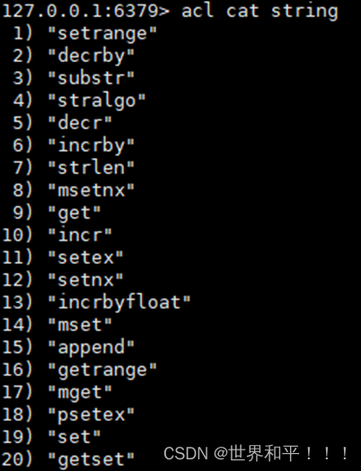 下面是有效ACL规则的列表。某些规则只是用于激活或删除标志,或对用户ACL执行给定更改的单个单词。其他规则是字符前缀,它们与命令或类别名称、键模式等连接在一起。