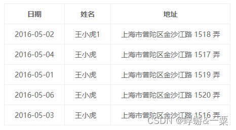 import { Table } from './Table.js'let table = new Table({el: 'main',column : [{ prop: "date", label: '日期' }, // prop为每行数据渲染字段,label为每列表头{ prop: "name", label: '姓名' },{ prop: "address", label: '地址' }],tableData : [{date: '2016-05-02',name: '王小虎1',address: '上海市普陀区金沙江路 1518 弄'},{date: '2016-05-04',name: '王小虎',address: '上海市普陀区金沙江路 1517 弄'},{date: '2016-05-01',name: '王小虎',address: '上海市普陀区金沙江路 1519 弄'},{date: '2016-05-06',name: '王小虎',address: '上海市普陀区金沙江路 1520 弄'},{date: '2016-05-03',name: '王小虎',address: '上海市普陀区金沙江路 1516 弄'}]