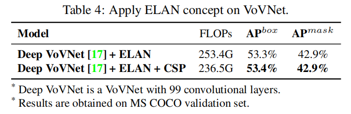 根据以上分析和在YOLOR-CSP中使用CSP融合进行的模型缩放实验,重新规划了VoVNet的过渡层并进行了实验。首先移除深度VoVNet的每个OSA模块的过渡层,只留下每个阶段中最后一个OSA模块中的过渡层。以与上述相同的方式组织网络的最长梯度路径和通过每个层的最短梯度路径。同时,还将CSPNet结构应用于上述网络,以进一步观察CSPNet的多功能性,相关实验结果如表4所示。可以清楚地看到,深度VoVNet已经从无法收敛变为能够很好地收敛并获得非常好的精度。