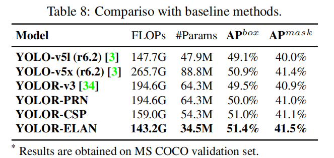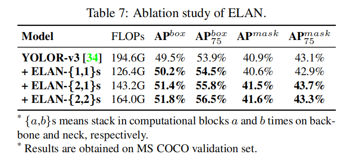 在ELAN中可以灵活地设置堆栈的数量,从而在精度和计算量之间进行权衡。从表7中列出的实验结果可以看到,在堆栈设置2,1s,YOLOR-ELAN可以在降低26%计算量的情况下,显著提高目标检测和实例分割的性能分别1.9%和0.6%。
