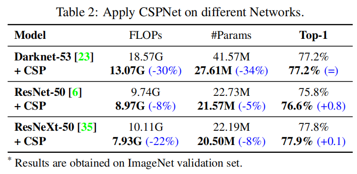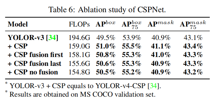 CSPNet的另一个优点是它可以应用于许多流行的网络架构,并在各个方面提高整体网络效率。在表2中展示了应用于几种流行网络架构的CSPNet的优异性能。最后,由于CSPNet对许多硬件资源的要求较低,因此它适用于具有更严格硬件约束的设备上的高速推理。