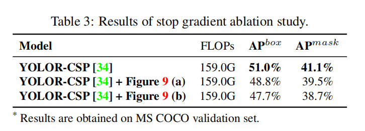 使用Microsoft COCO数据集中的目标检测和实例分割作为基线模型,对YOLOR CSP进行消融研究,结果如表3所示。实验结果表明,在ResNet中执行缩短的梯度路径确实是深度网络更好收敛的重要因素。
