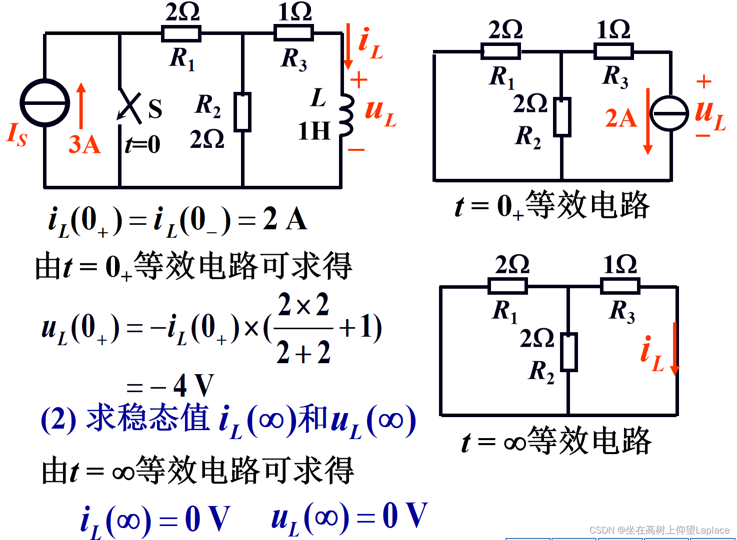 关于结论2,在0-的那一瞬间,因为没有储能,u_{C}=0,所以电容看作短路,i_{L}=0,所以电感看作开路。