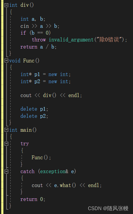 sp2(new int)中new int开辟空间失败抛异常,程序会直接跳到主函数的catch捕获程序部分,然后接着主函数catch捕获程序部分往后执行代码,此时Func函数栈帧已经销毁,sp1智能指针通过系统自动调用智能指针类的析构函数将sp1智能指针指向的空间进行了释放,解决了内存泄漏的问题。 // 使用RAII思想设计的SmartPtr类 templateclass SmartPtr { public:SmartPtr(T* ptr = nullptr): _ptr(ptr){}~SmartPtr(){if (_ptr)delete _ptr;}private:T* _ptr; }; int div() {int a, b;cin >> a >> b;if (b == 0)throw invalid_argument("除0错误");return a / b; } void Func() {//使用方法一int* p1 = new int;SmartPtr sp1(p1);//使用方法二SmartPtr sp2(new int);cout << div() << endl; } int main() {try {Func();}catch (const exception& e){cout << e.what() << endl;}return 0; }