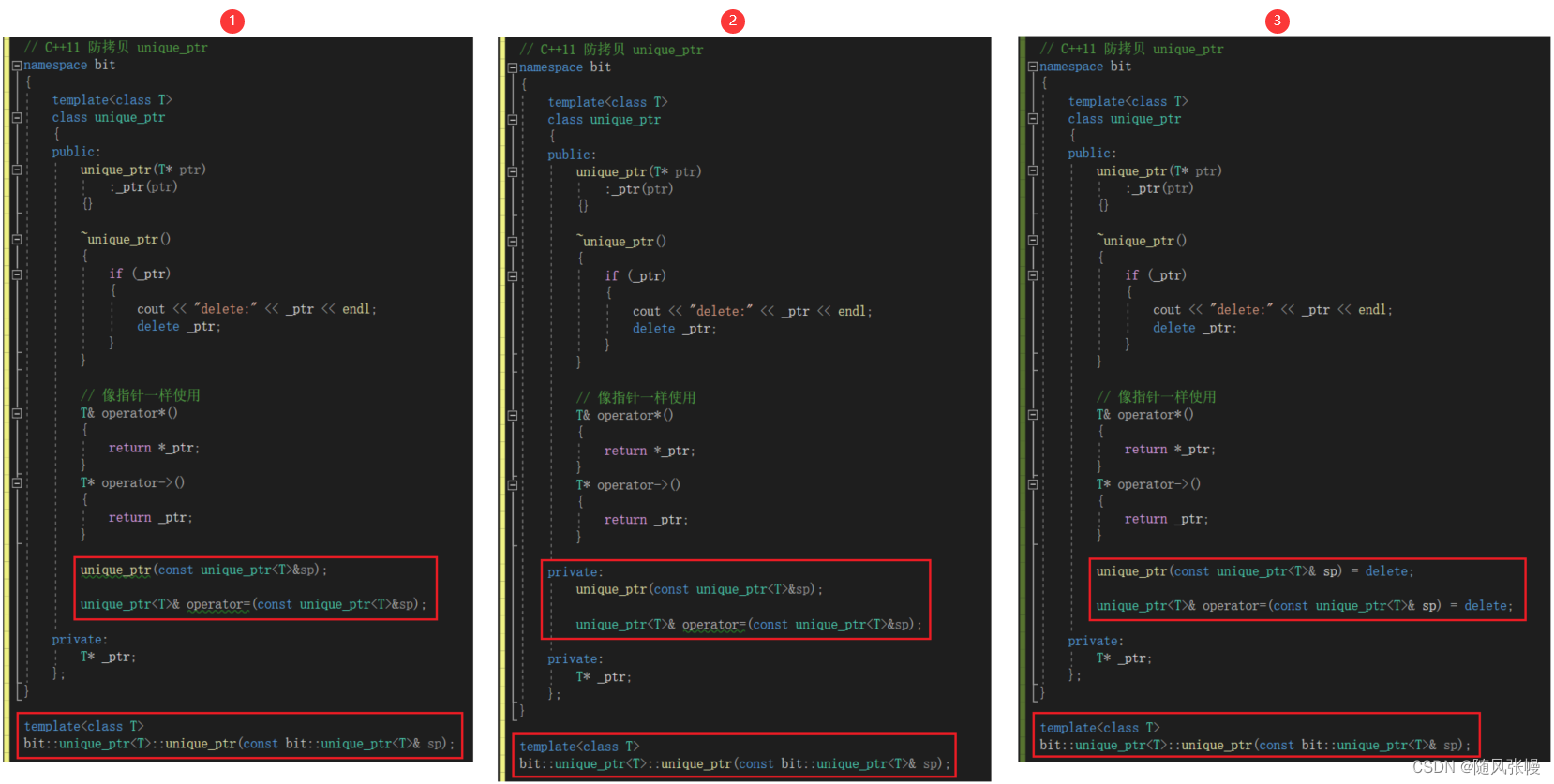1.防拷贝的方法是拷贝函数只声明不实现,但是仅仅只声明不实现是不行的,不排除一些老六在外面自己实现,如下图的①所示。为了防止这种情况,c++98的方法是将拷贝函数声明设置为私有,这样类外面就无法调用(即使老六自己实现了在类外面也无法调用拷贝函数),如下图②所示,c++11的方法是直接在拷贝函数声明的后面加一个=delete即可,这样拷贝函数不能再被调用(即使老六自己实现了在任何地方也都无法调用拷贝函数),如下图的③所示。![]()