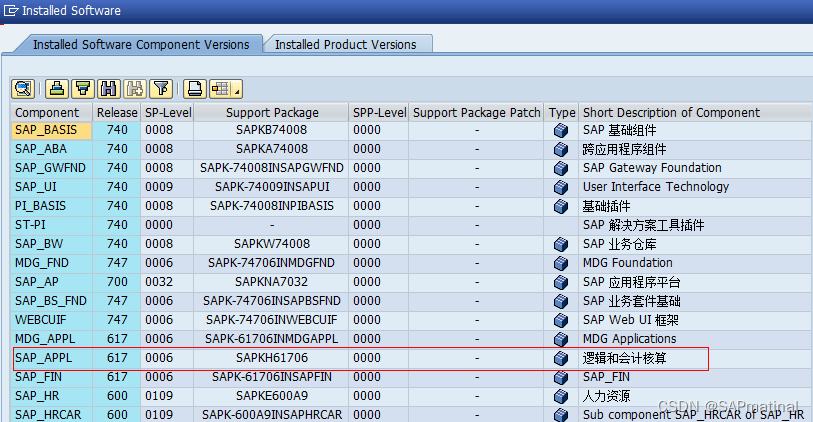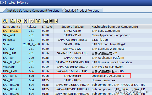 我们不妨看一下上面的两个图,如果“SAP_APPL”是“606”那么版本就是EHP6,如果是“617”那么版本就是EHP7。