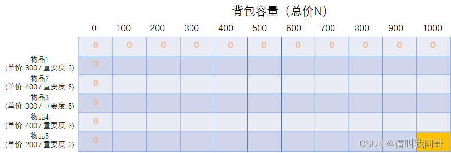 之所以需要m+1的行与N+1的列空间,正如你所见,我们需要一个0行0列,来表示什么都不放的时候背包的最大价值,虽然听起来像废话。你也可以把它理解为初始值,而在问哥看来,这一行一列的作用就是为了方便后面的推演计算。所以总而言之,我们需要m+1行、N+1列的数组空间。