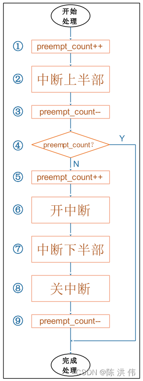 ⚫ 硬件中断 A 处理过程中,没有其他中断发生: 一开始,preempt_count = 0;上述流程图①~⑨依次执行,上半部、下半部的代码各执行一次。