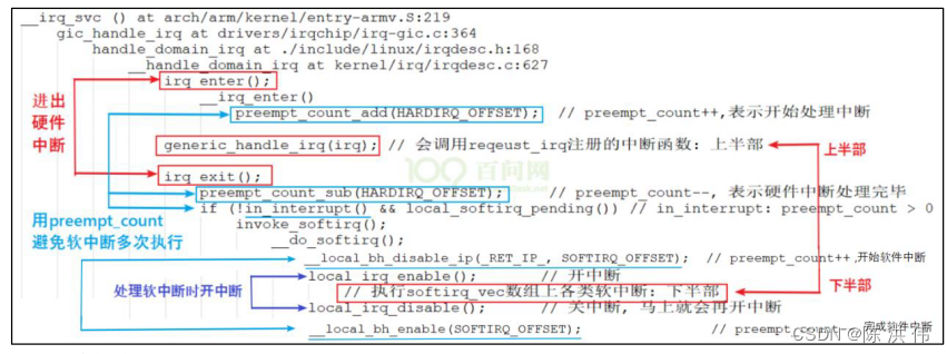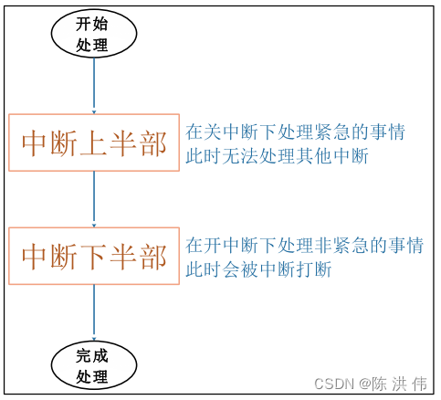 假设我们把中断分为上半部、下半部。发生中断时,上半部下半部的代码何时、如何被调用?