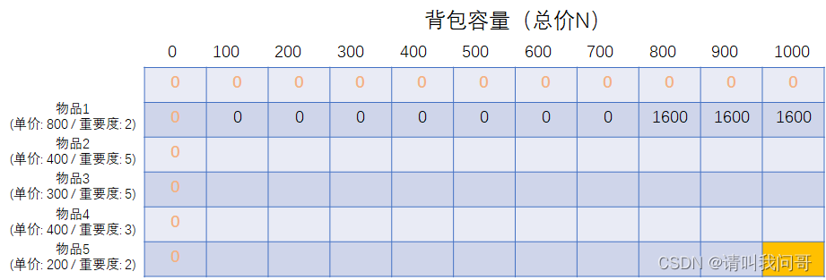 举例来说,当我们放入物品1的时候,由于物品1的单价是800,所以如果背包的容量小于800,我们什么都放不下(这时还无需考虑其他物品),所以只有当容量大于等于800的时候,可以组成的最高总价为1600(800*2),表格更新为下图(我们省略了801、802这样的颗粒度的数据)
