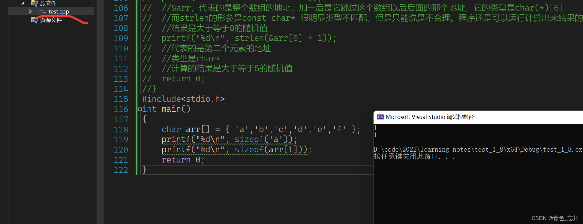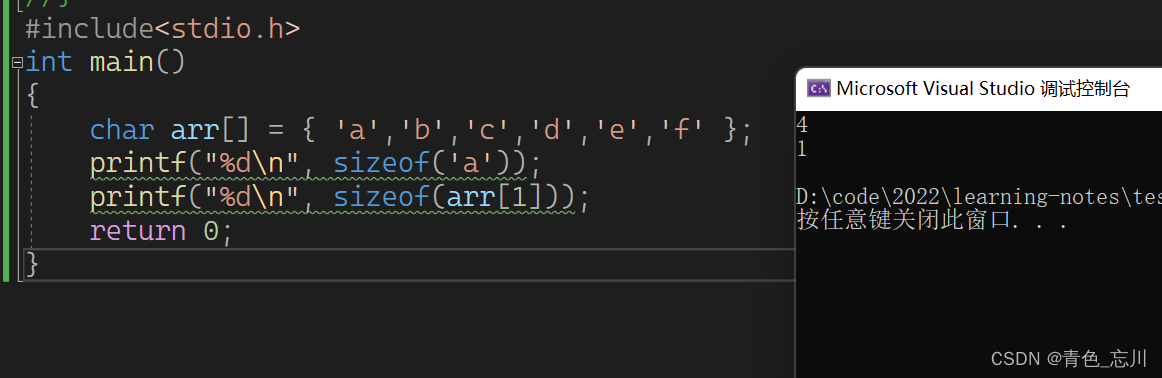 //sizeof(数组名),次数数组名代表的是整个数组的地址,计算的是整个数组的大小,这个数组只有6个元素,没有\0