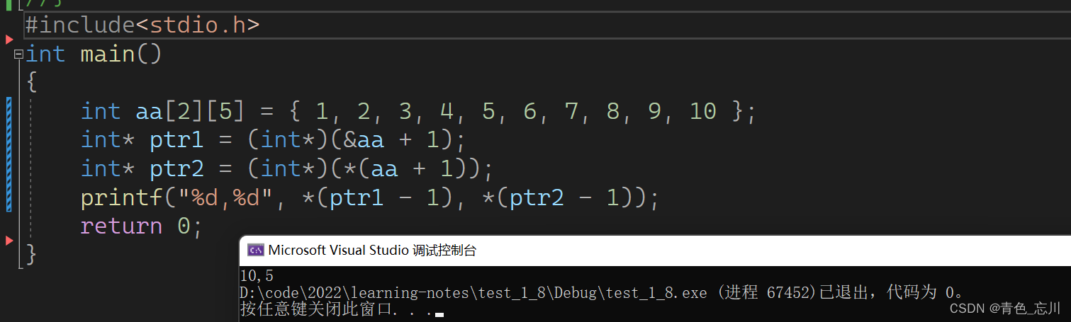 {int aa[2][5] = { 1, 2, 3, 4, 5, 6, 7, 8, 9, 10 };int* ptr1 = (int*)(&aa + 1);int* ptr2 = (int*)(*(aa + 1));printf("%d,%d", *(ptr1 - 1), *(ptr2 - 1));return 0;