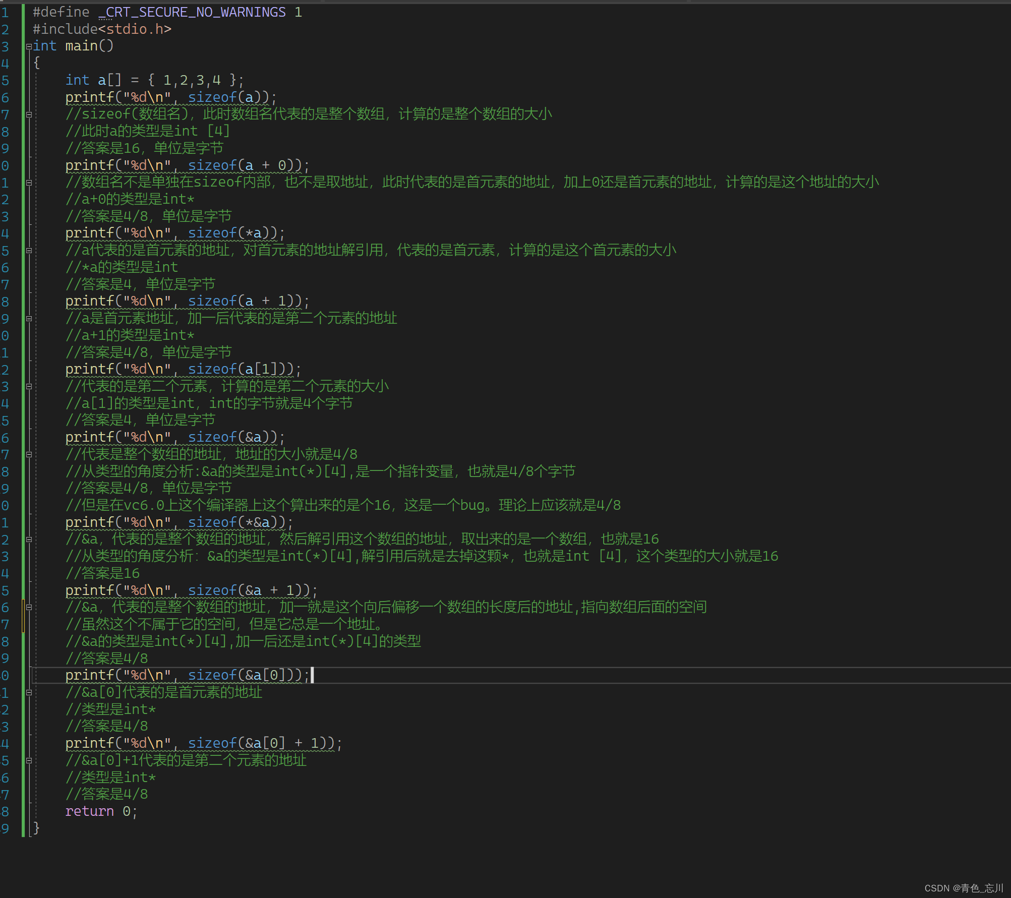 {int a[] = { 1,2,3,4 };printf("%d\n", sizeof(a));printf("%d\n", sizeof(a + 0));printf("%d\n", sizeof(*a));printf("%d\n", sizeof(a + 1));printf("%d\n", sizeof(a[1]));printf("%d\n", sizeof(&a));printf("%d\n", sizeof(*&a));printf("%d\n", sizeof(&a + 1));printf("%d\n", sizeof(&a[0]));printf("%d\n", sizeof(&a[0] + 1));