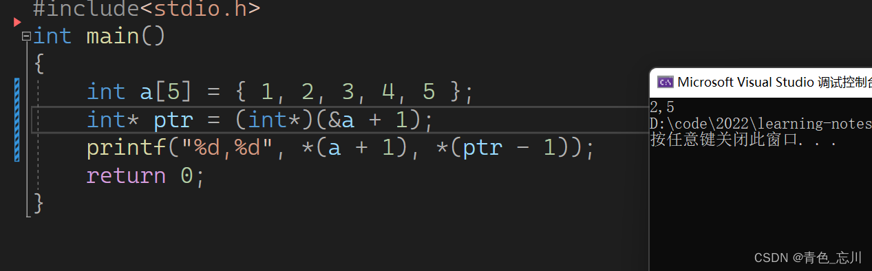 {int a[5] = { 1, 2, 3, 4, 5 };int* ptr = (int*)(&a + 1);printf("%d,%d", *(a + 1), *(ptr - 1));return 0;