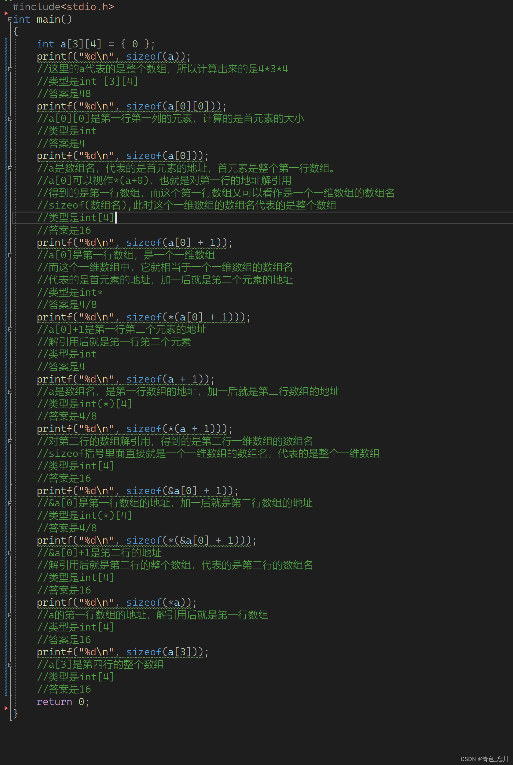 {int a[3][4] = { 0 };printf("%d\n", sizeof(a));printf("%d\n", sizeof(a[0][0]));printf("%d\n", sizeof(a[0]));printf("%d\n", sizeof(a[0] + 1));printf("%d\n", sizeof(*(a[0] + 1)));printf("%d\n", sizeof(a + 1));printf("%d\n", sizeof(*(a + 1)));printf("%d\n", sizeof(&a[0] + 1));printf("%d\n", sizeof(*(&a[0] + 1)));printf("%d\n", sizeof(*a));printf("%d\n", sizeof(a[3]));