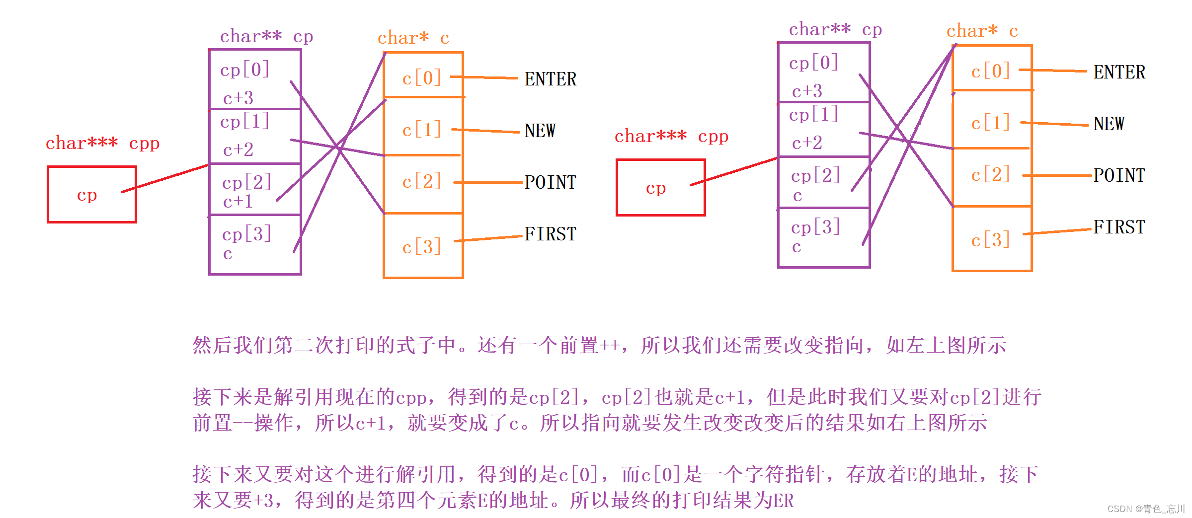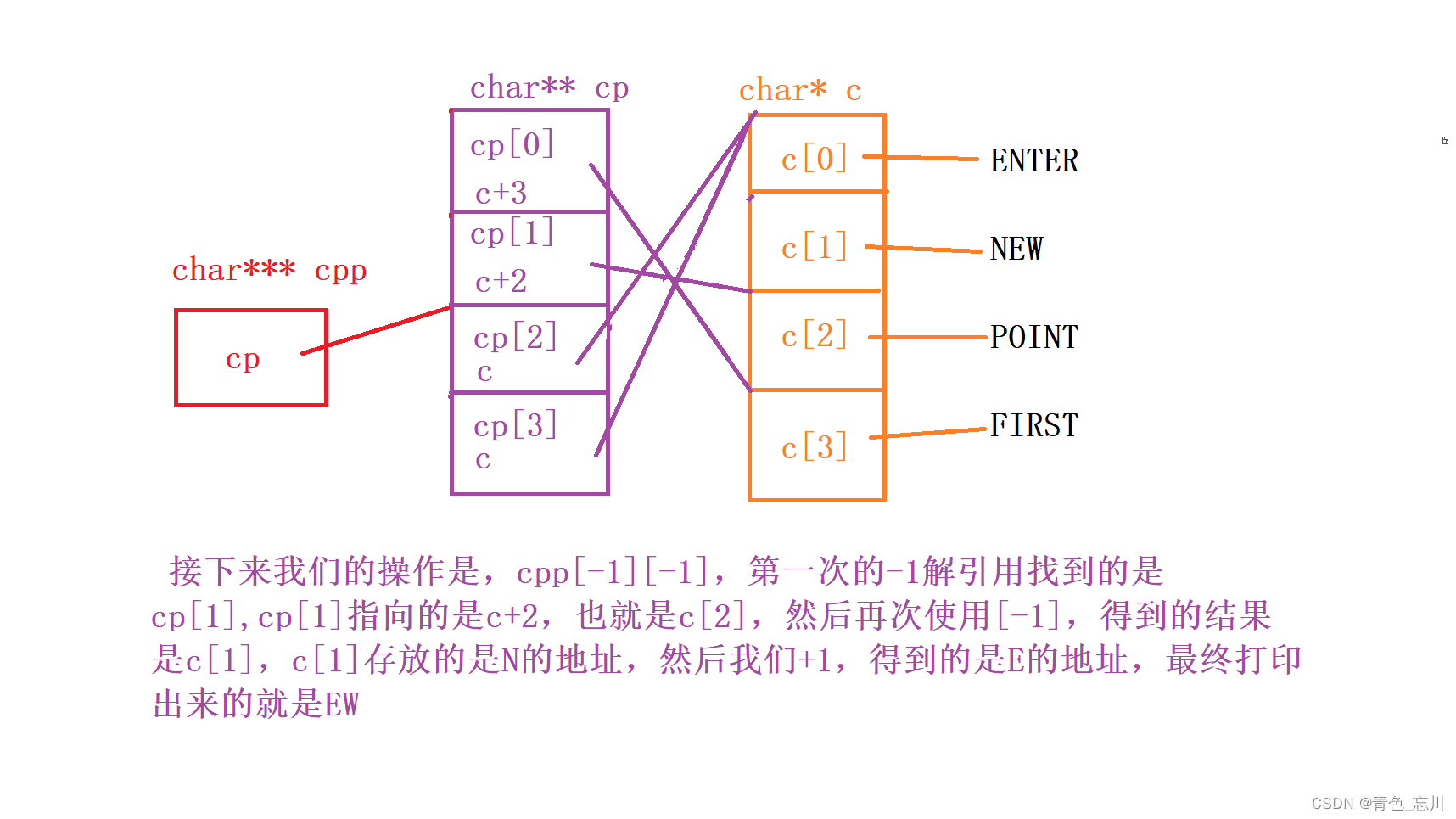 然后我们第一次解引用,找到了cp[1],cp[1]的内容是c+2。c+2所指向的内容是c[2],我们对c[2]再度解引用,得到的是POINT。