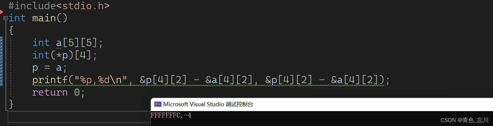 {int a[5][5];int(*p)[4];p = a;printf("%p,%d\n", &p[4][2] - &a[4][2], &p[4][2] - &a[4][2]);return 0;