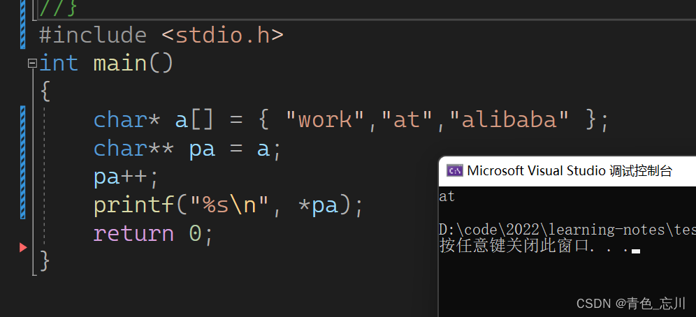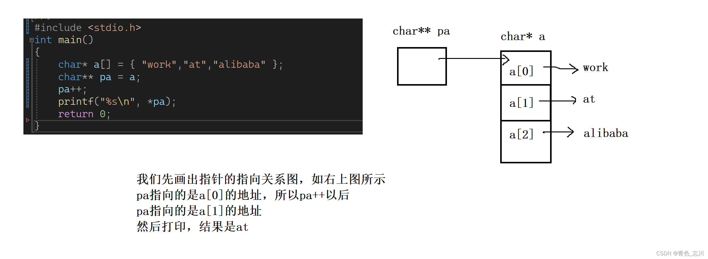{char* a[] = { "work","at","alibaba" };char** pa = a;pa++;printf("%s\n", *pa);return 0;