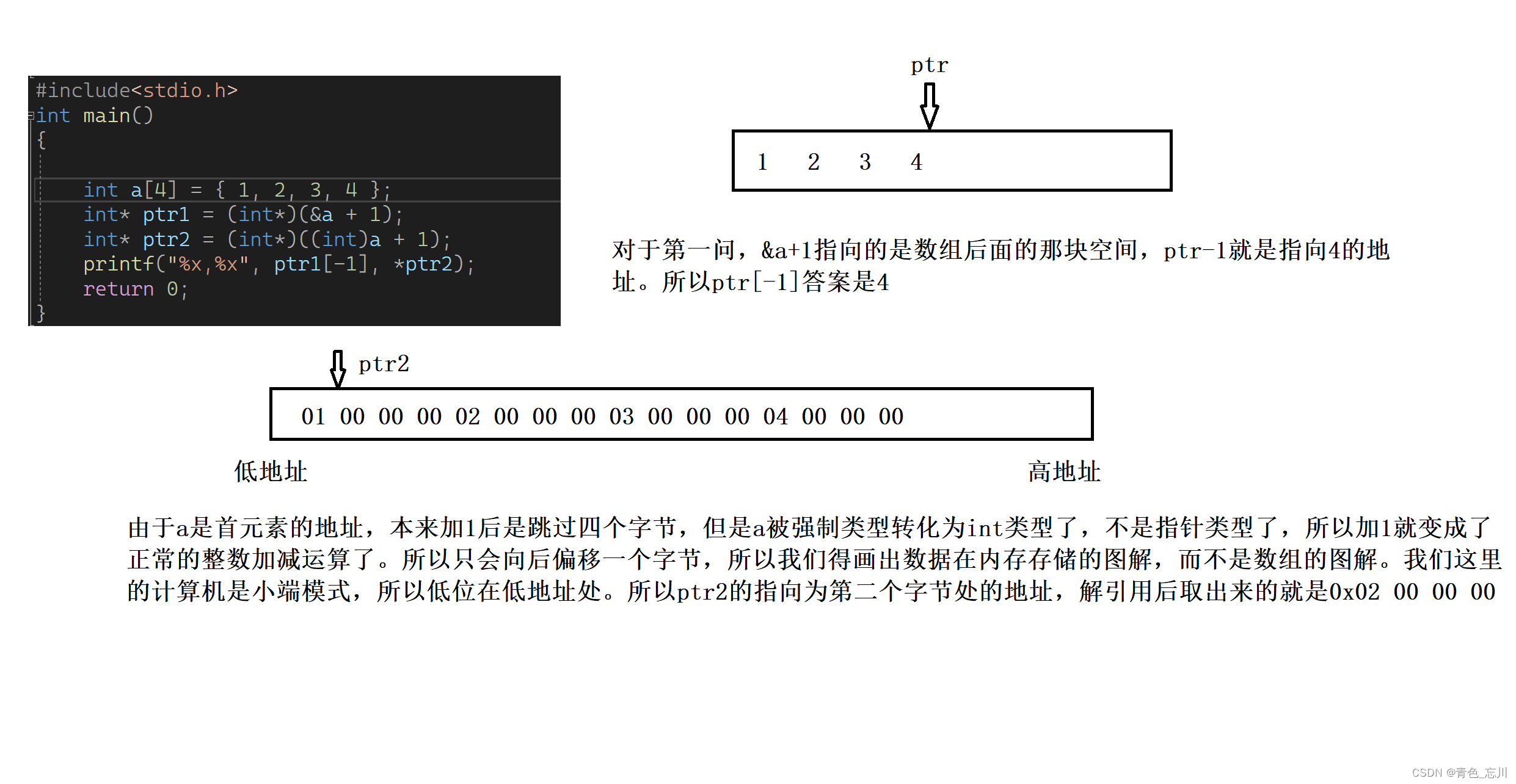 {int a[4] = { 1, 2, 3, 4 };int* ptr1 = (int*)(&a + 1);int* ptr2 = (int*)((int)a + 1);printf("%x,%x", ptr1[-1], *ptr2);return 0;