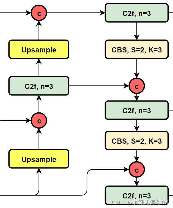 head:- [-1, 1, nn.Upsample, [None, 2, 'nearest']]- [[-1, 6], 1, Concat, [1]] # cat backbone P4- [-1, 3, C2f, [512]] # 13- [-1, 1, nn.Upsample, [None, 2, 'nearest']]- [[-1, 4], 1, Concat, [1]] # cat backbone P3- [-1, 3, C2f, [256]] # 17 (P3/8-small)- [-1, 1, Conv, [256, 3, 2]]- [[-1, 12], 1, Concat, [1]] # cat head P4- [-1, 3, C2f, [512]] # 20 (P4/16-medium)- [-1, 1, Conv, [512, 3, 2]]- [[-1, 9], 1, Concat, [1]] # cat head P5- [-1, 3, C2f, [1024]] # 23 (P5/32-large)- [[15, 18, 21], 1, Detect, [nc]] # Detect(P3, P4, P5)