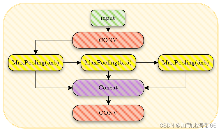 class SPPF(nn.Module):# Spatial Pyramid Pooling - Fast (SPPF) layer for YOLOv5 by Glenn Jocherdef __init__(self, c1, c2, k=5): # equivalent to SPP(k=(5, 9, 13))super().__init__()c_ = c1 // 2 # hidden channelsself.cv1 = Conv(c1, c_, 1, 1)self.cv2 = Conv(c_ * 4, c2, 1, 1)self.m = nn.MaxPool2d(kernel_size=k, stride=1, padding=k // 2)def forward(self, x):x = self.cv1(x)with warnings.catch_warnings():warnings.simplefilter('ignore') # suppress torch 1.9.0 max_pool2d() warningy1 = self.m(x)y2 = self.m(y1)return self.cv2(torch.cat([x, y1, y2, self.m(y2)], 1))