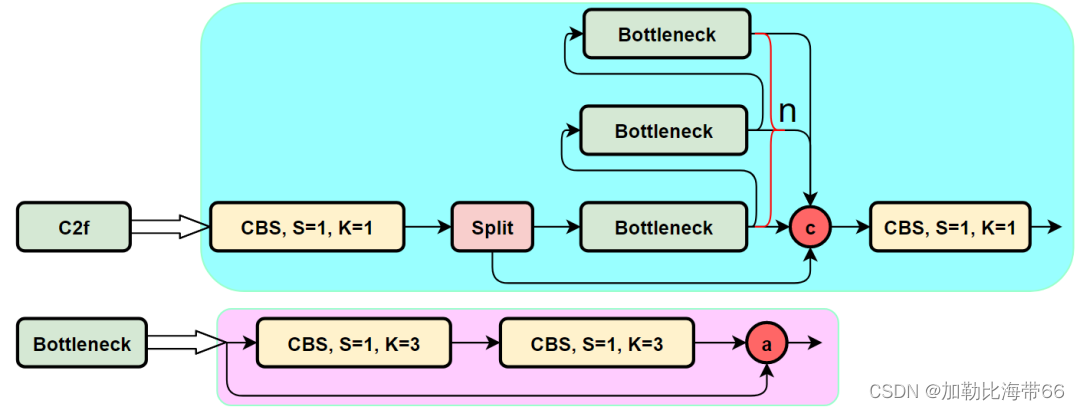 class C2f(nn.Module):# CSP Bottleneck with 2 convolutionsdef __init__(self, c1, c2, n=1, shortcut=False, g=1, e=0.5): # ch_in, ch_out, number, shortcut, groups, expansionsuper().__init__()self.c = int(c2 * e) # hidden channelsself.cv1 = Conv(c1, 2 * self.c, 1, 1)self.cv2 = Conv((2 + n) * self.c, c2, 1) # optional act=FReLU(c2)self.m = nn.ModuleList(Bottleneck(self.c, self.c, shortcut, g, k=((3, 3), (3, 3)), e=1.0) for _ in range(n))def forward(self, x):y = list(self.cv1(x).split((self.c, self.c), 1))y.extend(m(y[-1]) for m in self.m)return self.cv2(torch.cat(y, 1))