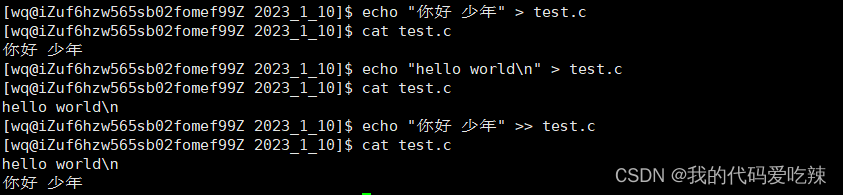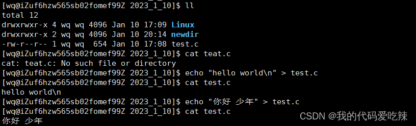 2.注意:如果没有此文件就会创建此文件 并将内容写入文件中,输出重定向的写入是覆盖式的写入,每一次重定向的写入会覆盖掉文件中的原内容。