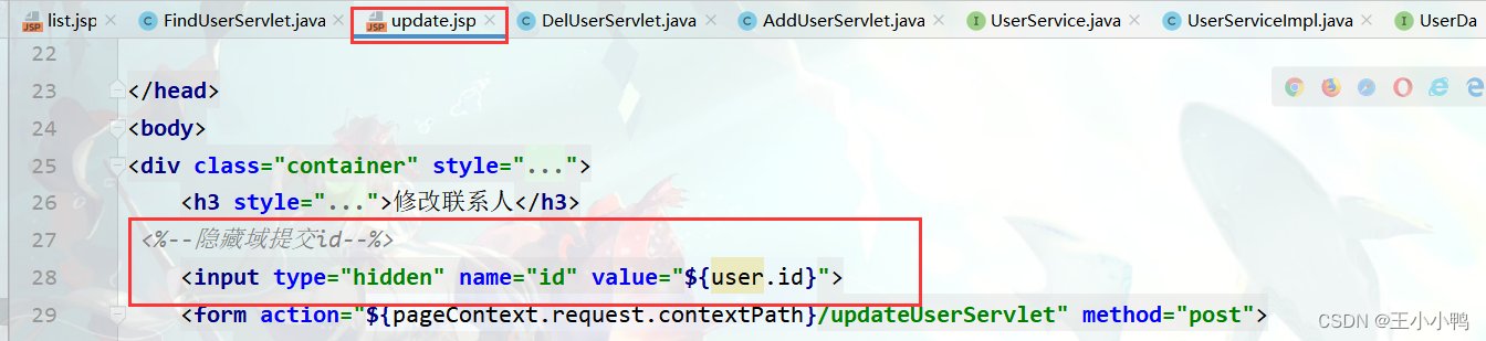 用户修改都是基于id,但是id是数据库生成的,在表单中没有体现,所以建一个隐藏域,将id创建在里面获取