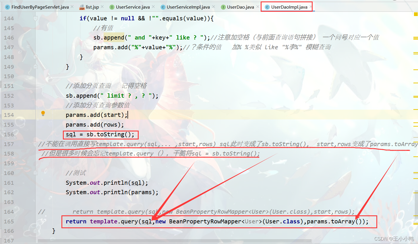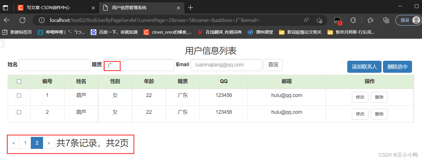 //1.设置编码request.setCharacterEncoding("utf-8");//2.获取参数Mapmap = request.getParameterMap();//3.封装对象User user = new User();try {BeanUtils.populate(user,map);} catch (IllegalAccessException e) {e.printStackTrace();} catch (InvocationTargetException e) {e.printStackTrace();}//4.调用service方法报错UserService service = new UserServiceImpl();service.addUser(user);//5.跳转到/userListServlet // 没有共享数据使用重定向 加上虚拟路径request.getContextPath()response.sendRedirect(request.getContextPath()+"/userListServlet"); UserDaoImpl中的addUser方法也优化了@Overridepublic User addUser(User user) {try {//第一版 //String sql = "insert into user2 set name = ?, gender = ?, age = ?, address = ?, qq= ?, email = ?";//第二版String sql ="insert into user2 values(null, ?, ?, ?, ?, ?, ?,null, null )";template.update(sql, user.getName(), user.getGender(), user.getAge(), user.getAddress(), user.getQq(), user.getEmail());} catch (DataAccessException e) {e.printStackTrace();}return user;}添加用户成功!