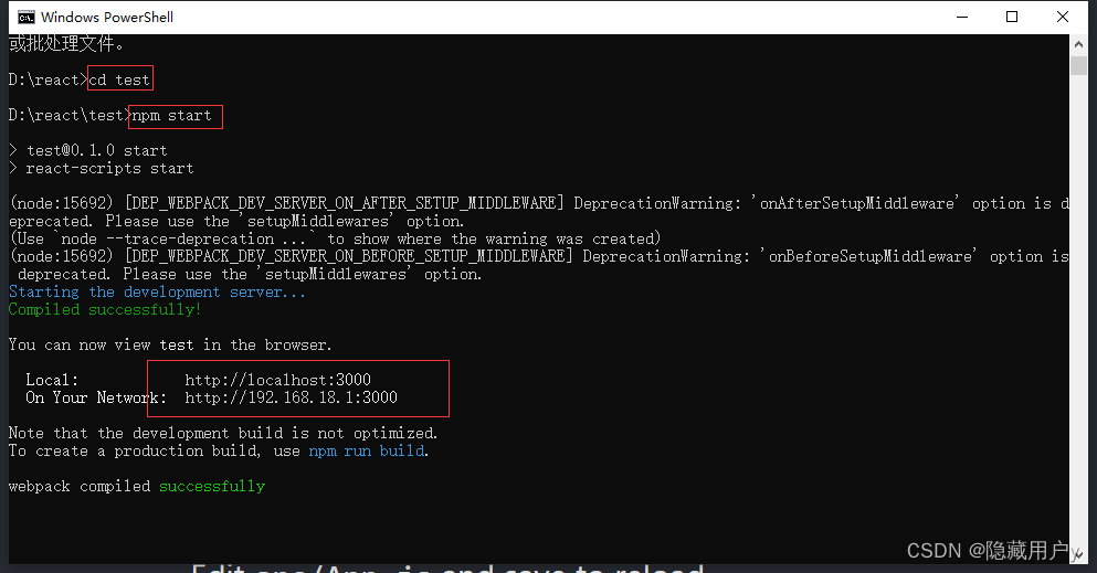 最终我重新npm新项目,然后删除所有src文件,新建文件index.js,输入第一个程序,重新npm start,终于成功(泪